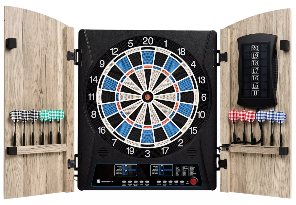 Smart Dartboard Cabinet with Digital Scorekeeping and Soft Tip Dart Set